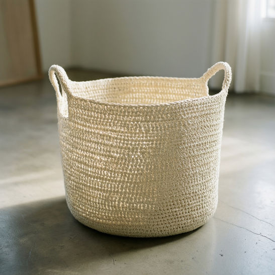 Features a range of decorative crochet home objects like baskets and centerpieces. The project focuses on the minimalist appeal and warm textures of the creations, designed to add a touch of artisanal luxury to interior spaces.
